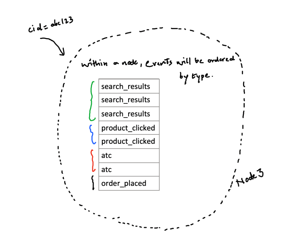 Within a partition in a respective node, events would be stored in order of clustering key, in our scenario event_type