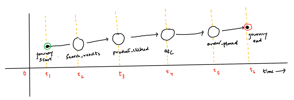 t4 + δ -> attributed_journey{cid=abc123, query=red tshirt, ordered=[123]}