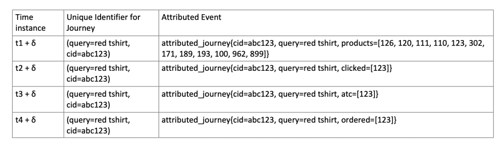 t1 + δ -> attributed_journey{cid=abc123, query=red tshirt, products=[126, 120, 111, 110, 123, 302, 171, 189, 193, 100, 962, 899]}