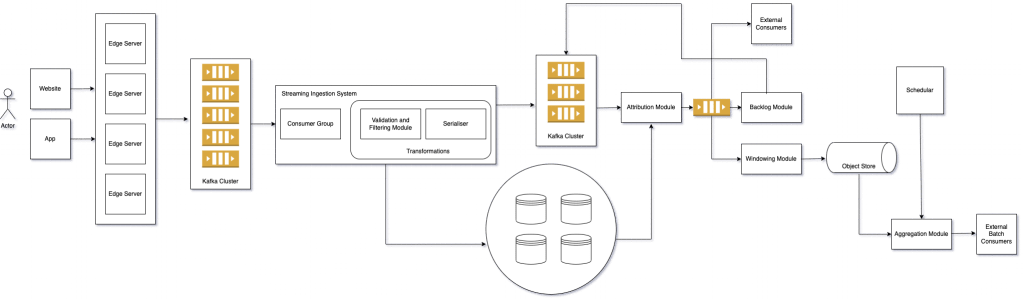 Streaming ingestion system will consume events from Kafka, deserialise them. Validate and filter valid events required for attributing a particular conversion journey. Finally we need to serialise these transformed events and push them to another Kafka topic and store them in a datastore. Apache Flink being backed by a true streaming engine is perfectly suitable for a low latency event by event stream processing.